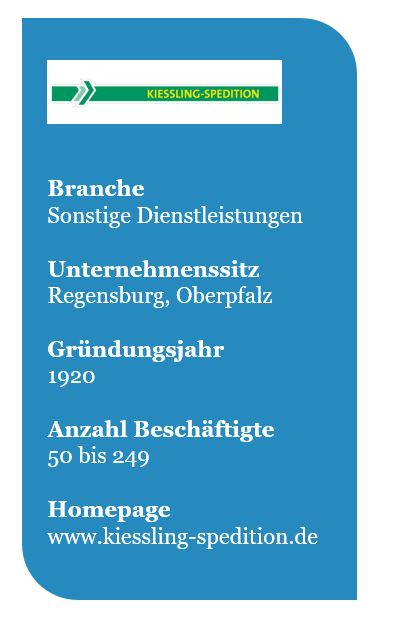 Die Kiessling-Spedition ist ein national und international erfolgreiches Speditions- und Logistikunternehmen und bereits in 4. Generation in Familienhand. Dem Unternehmen ist es wichtig, ein familienfreundlicher Arbeitgeber zu sein und den Angestellten bei der Vereinbarkeit von Beruf und Familie möglichst flexibel entgegenzukommen. Daher haben die Verantwortlichen für sie immer ein offenes Ohr und nehmen sich Zeit, um gemeinsam passende Lösungen zu entwickeln.
