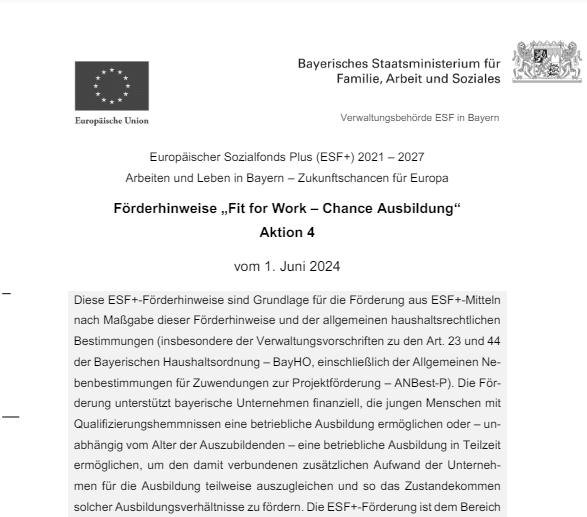 Die Ausbildungsinitiative "Fit for Work - Chance Ausbildung" bietet finanzielle Unterstützung für bayerischen Unternehmen und Betrieben, die sich durch Bereitstellung von Ausbildungsplätzen für benachteiligte junge Menschen oder für Teilzeitausbildungsverhältnisse engagieren. Das Programm hat zum Ziel, die Chancen auf eine berufliche Ausbildung zu erhöhen und den Einstieg ins Erwerbsleben zu fördern – auch für diejenigen, die Startschwierigkeiten haben und aus ganz unterschiedlichen Gründen Unterstützung auf ihrem Weg in den Beruf benötigen.